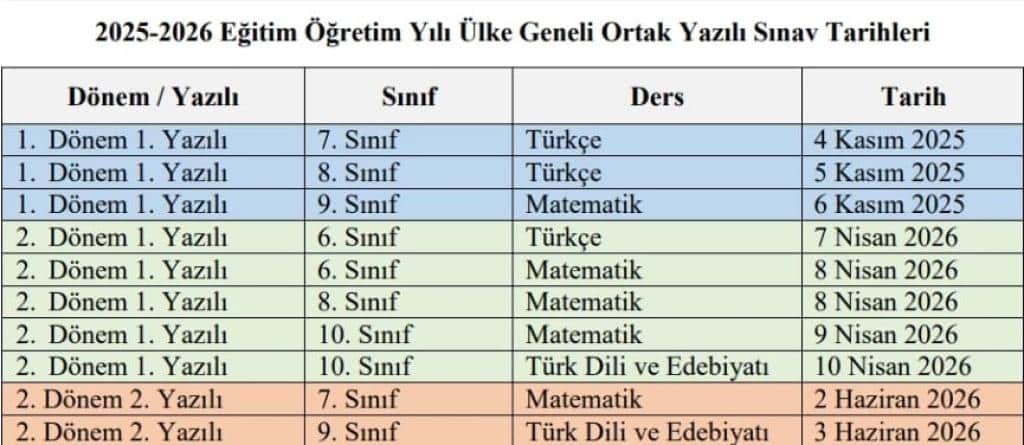 2025-2026 Eğitim Öğretim Yılı Ülke Geneli Ortak Yazılı Sınav Tarihleri